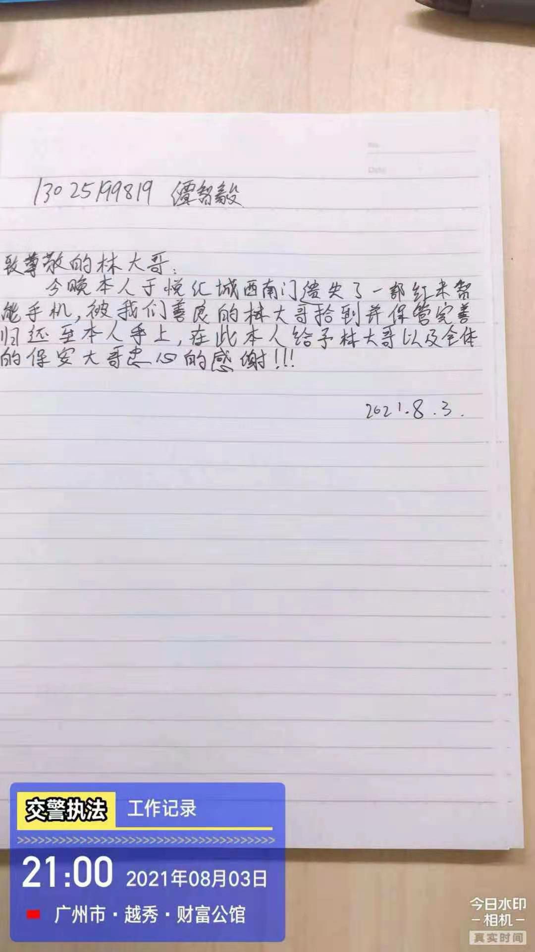 2021年8月3日,中国·618永利(集团)有限公司-官方网站驻西村悦汇城保安员林伟强像往常一样准备交接岗,当走至负一西南门门口的时候发现地上有一部黑色智能手机,林伟强在现场等待失主并上报了当班值班经理,不一会儿失主打电话过来,核实了失主身份后将失物归还。失主十分感动,并现场手写感谢信一封以表谢意。